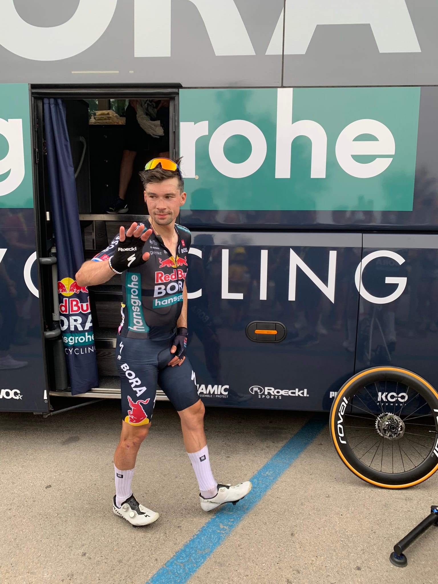 At the finish line was a terrible crowd, and we couldn’t find a spot for ourselves. So we headed straight to the team buses, specifically to the Red Bull – Bora Hansgrohe bus, which was stationed right behind the finish line. There, we waited for Primož Roglič and the other cyclists from the RBH team. Jay Hindley, Primož Roglič’s teammate, gave a gift, a water bottle, to my son upon arrival. Super, super!”