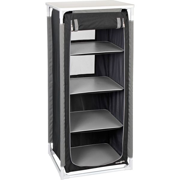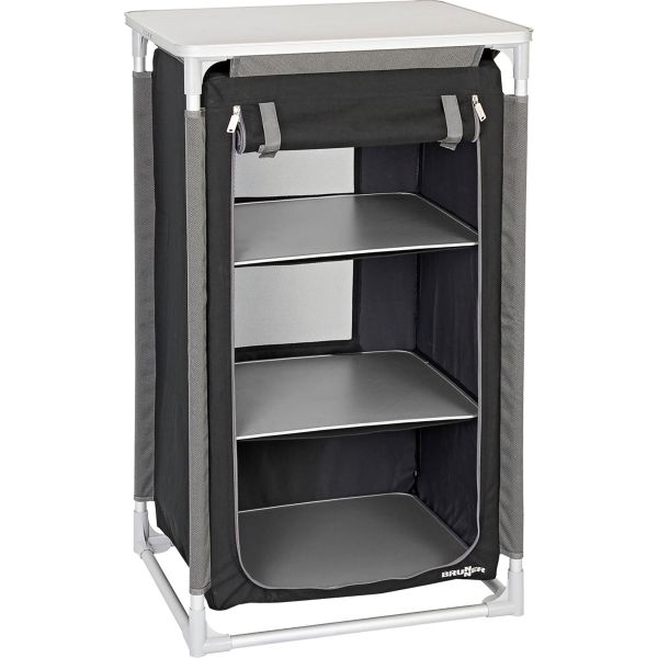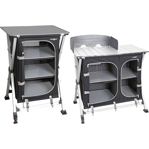 Kamp omarica Azabache je zasnovana s prednameščenim aluminijastim okvirjem, ki je oblečen v kakovosten in trpežen poliester v elegantni antracitni barvi. Kanali iz odpornega ripstop poliestra s hrbtno prezračevalno mrežo omogočajo hitro postavitev in pospravljanje. Police se enostavno namestijo v konstrukcijo, nastavljive vrtljive nogice pa poskrbijo za stabilnost tudi na neravnih tleh. Zgornji del stabilne konstrukcije služi kot delovna površina. V kompletu je priložena praktična torba za prenašanje in shranjevanje. Različica kamp kuhinje ponuja 90 cm visoko delovno površino z vgrajenim odstranljivim zložljivim koritom, tremi policami na desni strani, dvema na levi ter zaščito pred vetrom in pršenjem.