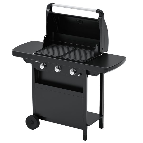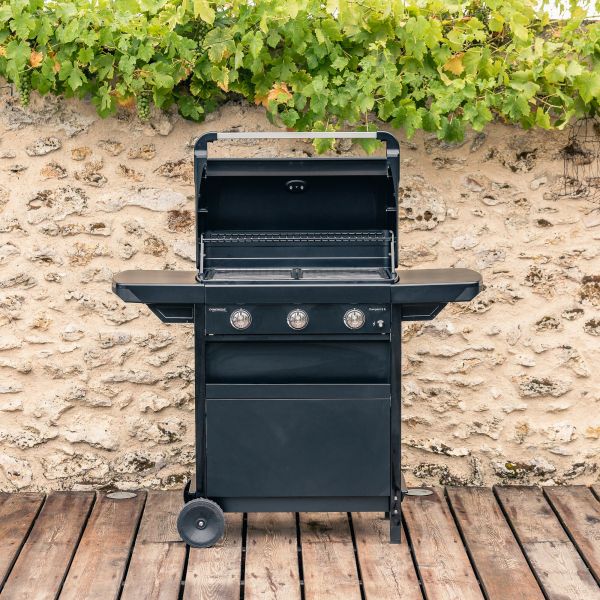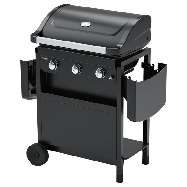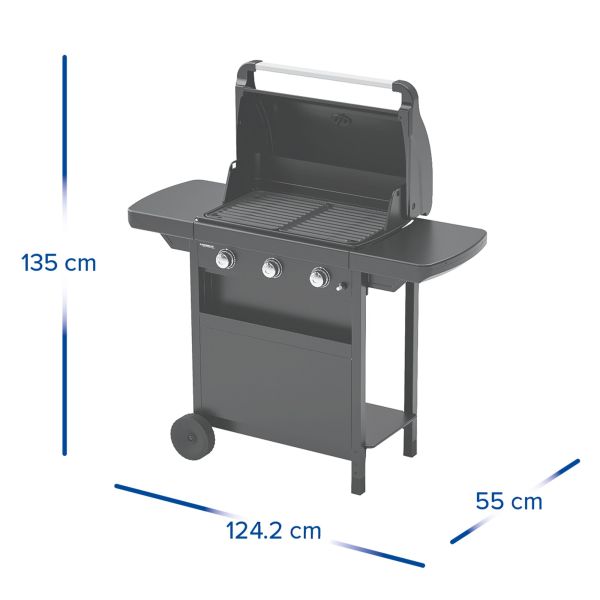 Kompakten plinski žar s tremi gorilniki za enakomerno peko in enostavno shranjevanje.