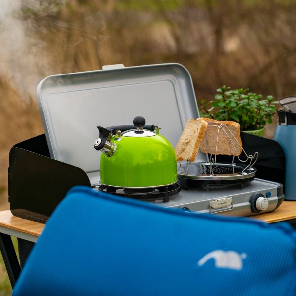 Lahek in eleganten čajnik s piščalko iz nerjavnega jekla. Toplotno izoliran zložljiv ročaj omogoča varno in udobno uporabo, velika odprtina za polnjenje pa enostavno dolivanje in čiščenje. Vgrajena piščalka opozori, ko voda zavre, kar združuje funkcionalnost in sodoben dizajn – idealno za vsakodnevno uporabo doma ali na poti.