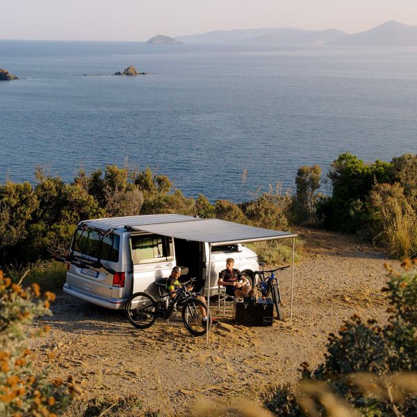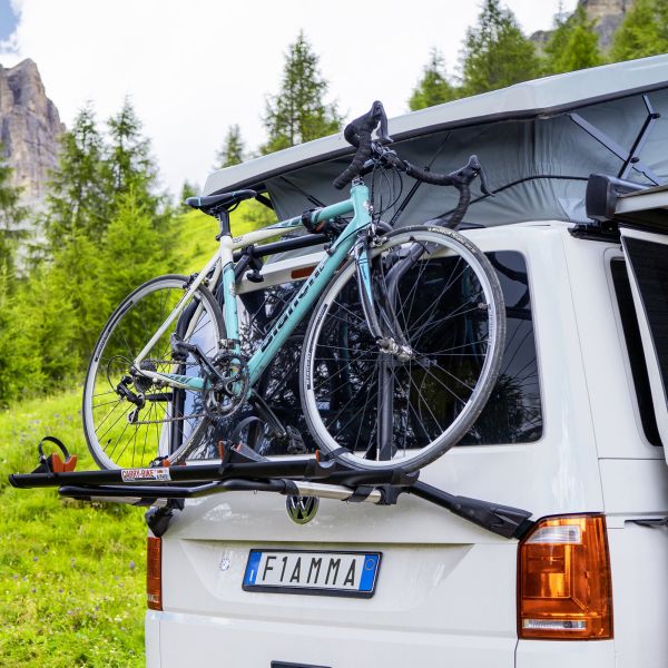 Nosilec za kolesa, posebej razvit za VW T6, v barvi deep black, s trdnim sidranjem na ojačitvenih točkah vrat prtljažnika in primernostjo za vozila z dvižno streho.