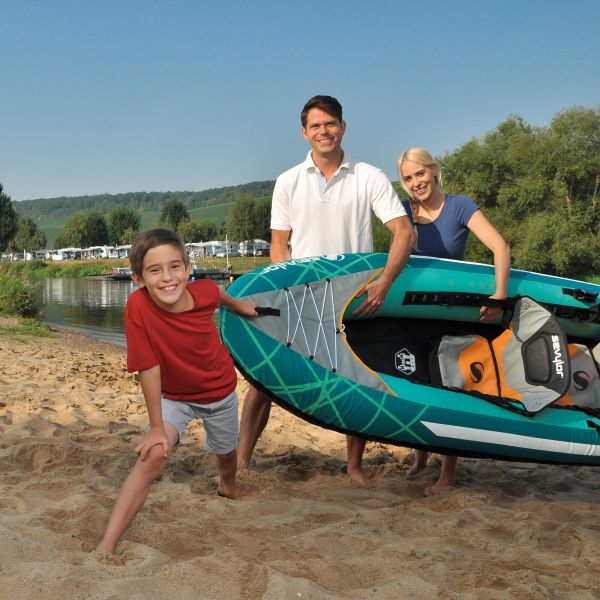 Napihljiv družinski kajak s 3 odstranljivimi nastavljivimi sedeži, sistemom Easy Inflation in trpežnim dnom iz tarpaulina. Primeren za zaščitene obale in celinske vode, z največjo nosilnostjo 210 kg.