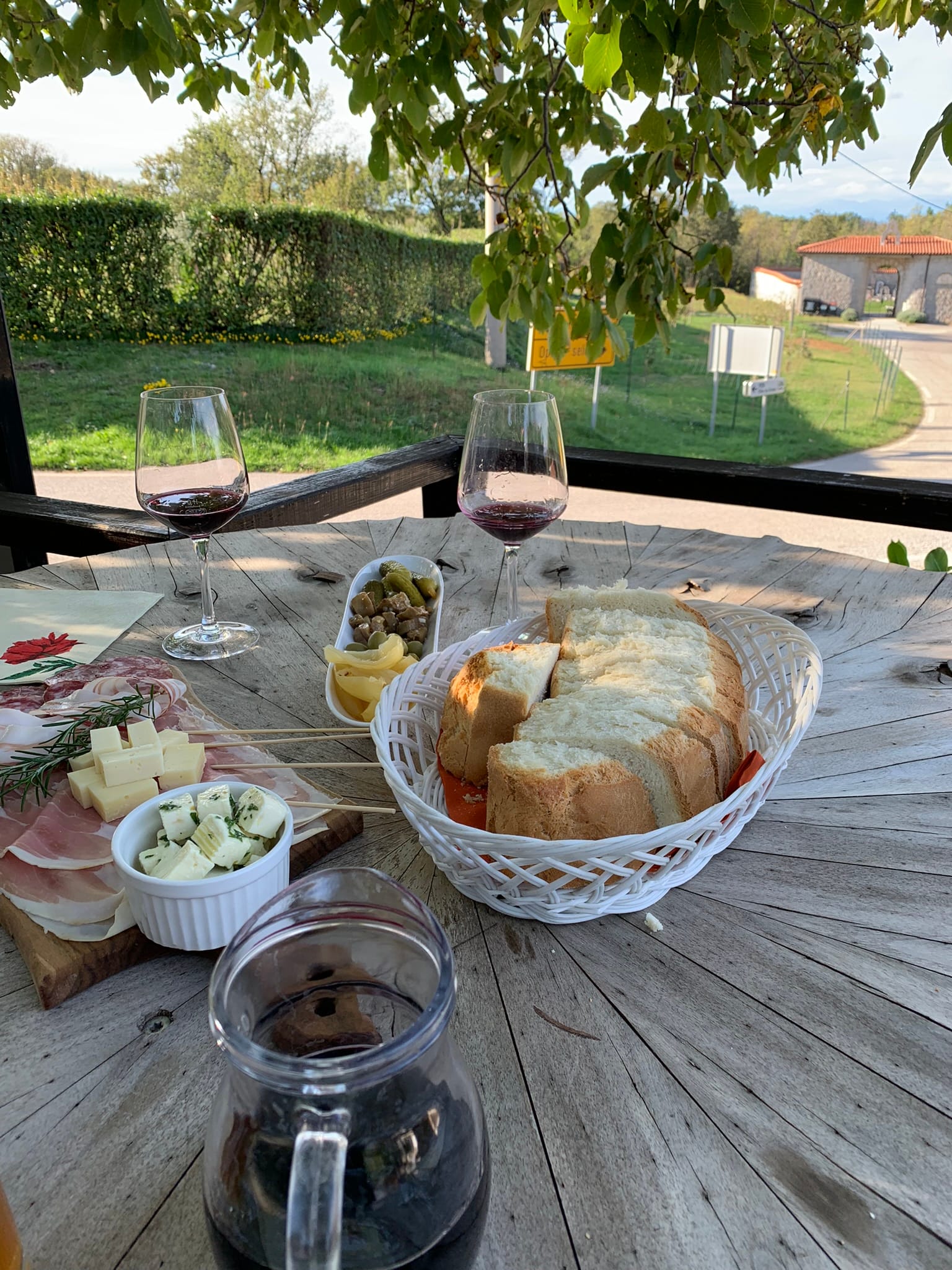 Po namestitvi smo se odpravili na sprehod skozi vas. Vedno si radi ogledamo okolico. Ustavili smo se v izletniški kmetiji in osmici Pri Krčarju: https://prikrcarju-osmica.si/.  Kljub temu, da so imeli vse zasedeno in rezervirano, so nas prijazno sprejeli, ter nas postregli s hrano in pijačo. Ne morem prehvalit pršuta, ki se je v ustih kar stopil, prav tako ne morem prehvaliti terana, ki je jezik dobesedno pobožal. Jedli in pili smo zunaj, krasen ambient! Že dolgo nisem tako uživala ob hrani in pijači. KRASen KRAS.